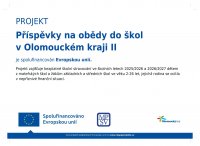 Tento projekt je spolufinancován Evropskou unií. Cílem dotačního programu je podpora dětí z rodin ohrožených chudobou a materiální a potravinovou deprivací nebo se ocitla v nepříznivé finanční situaci formou dotace/příspěvku na zajištění bezplatného školního stravování v Olomouckém kraji.